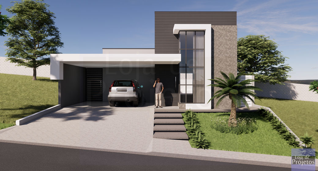 Projeto de uma residência térrea com arquitetura contemporânea e funcionalidade ideal para um casal com dois filhos. A fachada destaca linhas retas, grandes painéis de vidro e revestimentos modernos, enquanto o paisagismo integra o verde ao ambiente urbano. A planta oferece ambientes sociais amplos, como sala de estar e jantar integradas, além de uma cozinha conectada à varanda gourmet com churrasqueira. A área íntima inclui uma suíte master com closet e dois quartos para os filhos. A casa conta ainda com lavanderia funcional, lavabo social e garagem para dois carros, equilibrando conforto, estética e praticidade.