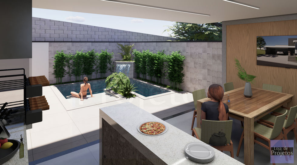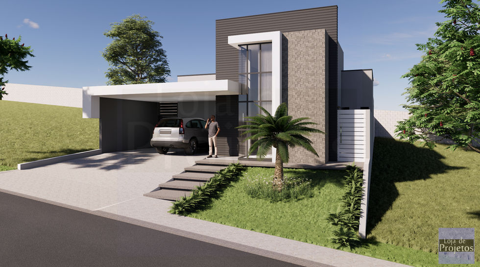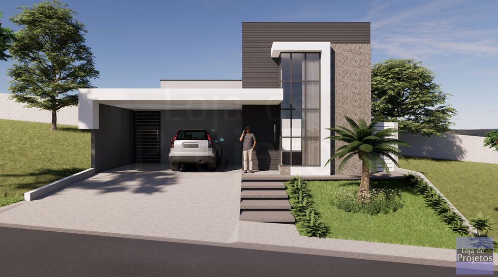 Projeto de arquitetura contemporâneo, elegante e funcional. Pode ser construído em terrenos com dimensões mínimas de 12 m x 25 m. Casa com 3 quartos, sendo um suíte com banheiro e closet anexos, 1 banheiro social, lavabo, sala de estar e sala de jantar integradas, cozinha, lavanderia, garagem para 2 carros, área gourmet e piscina.