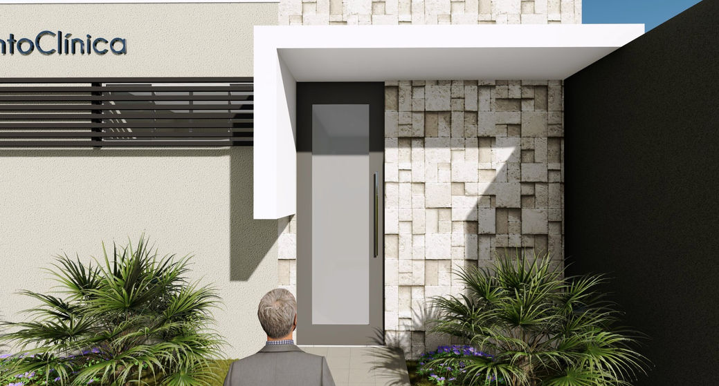 Projeto de clínica odontológica com 4 salas/consultórios, recepção, sanitários e espaços de apoio. Projeto com linhas retas e contemporâneas, explorando volumetrias e revestimentos cimentícios, para dar um ar sofisticado à fachada.